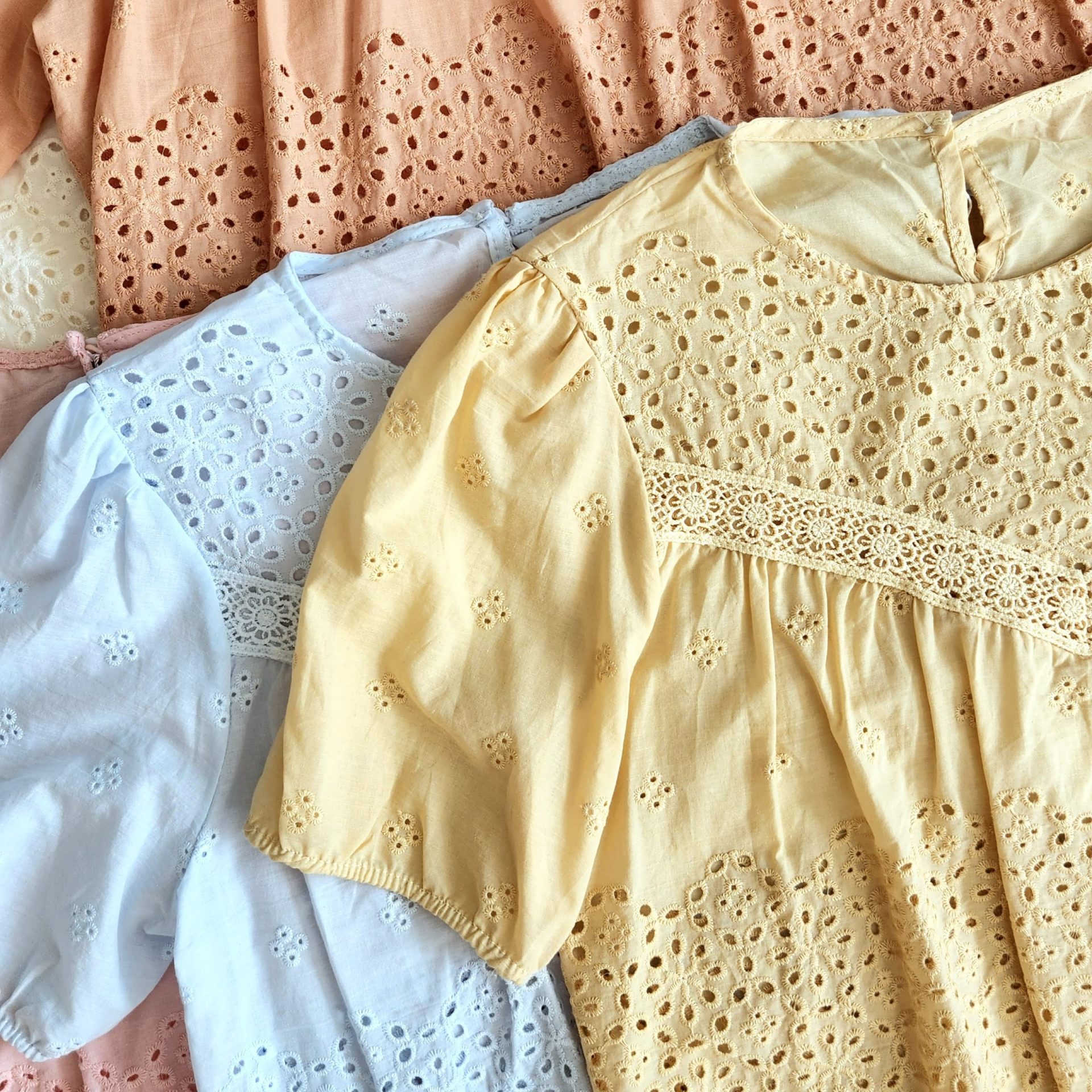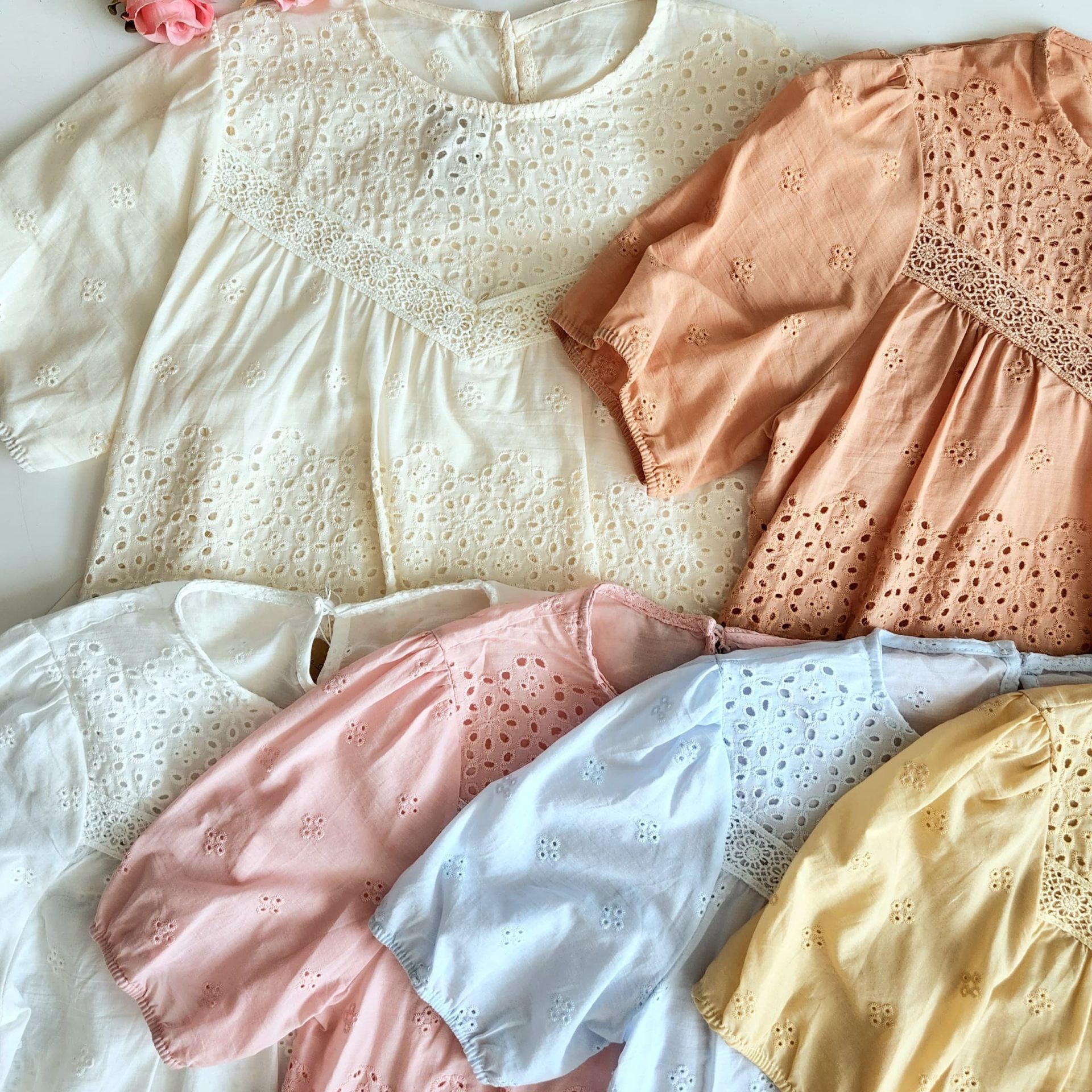Blue, cream, peach, Pink, White, Yellow